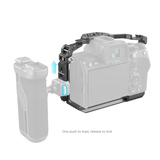 SmallRig HawkLock Quick Release Cage for Sony Alpha 7R V / Alpha 7 IV / Alpha 7S III / Alpha 1 / Alpha 7R IV 4481 is designed to provide accessory mounts and protect the camera. The patented self-developed quick-release structure (named HawkLock) covers cold shoes, NATO rail, and arca swiss, which is used with HawkLock eco-accessories to realize solid and no false position, one push to load, release to lock and improve the disassembly efficiency. It locks the camera via one bottom locating pin, one 1/4"-20 screw, and one M2.5 screw on the left side.