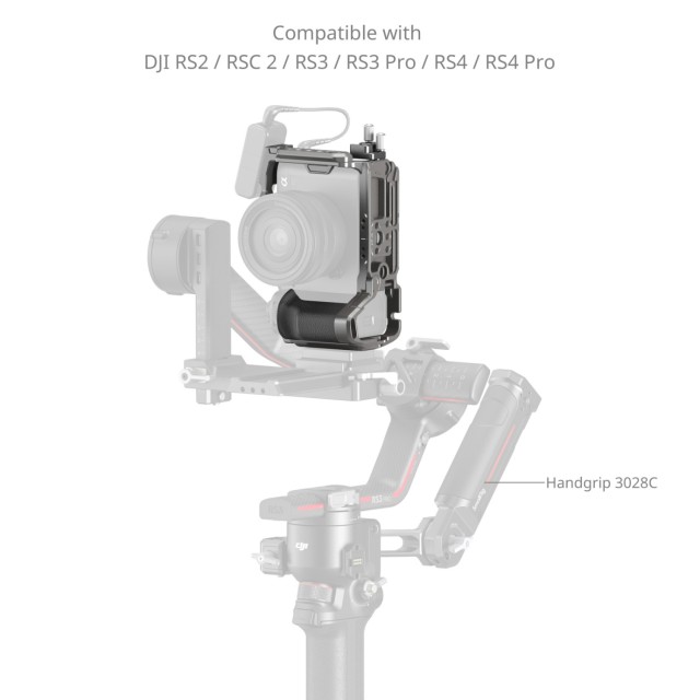 The cage incorporates various mounting interfaces, including multiple 1/4"-20 threaded holes and ARRI 3/8"-16 locating holes, allowing for the attachment of top handles (ID 3765, 4757) or side handles (ID 4755, 4840) for improved stability during handheld shooting. The cold shoe mount can be used for attaching DJI MIC II microphones or video lights. The bottom 1/4"-20 threaded hole can be used for mounting on desktop tripods or DJI RS stabilizers with a quick release plate for DJI RS Mini. The integrated Arca-Swiss quick release plate facilitates quick switching between handheld, tripod, and stabilizer shooting modes (compatible with DJI RS 2, RSC 2, RS 3, RS 3 Pro, RS 4, and RS 4 Pro). Additionally, there is a QD socket for attaching QD straps, along with strap slots on both sides and the bottom for wrist straps (ID 3848), shoulder straps (ID PSC2428), and other accessories.
