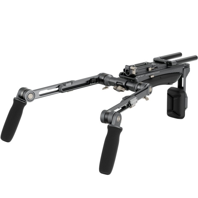 The shoulder rig kit features ergonomic handles with fine textures, providing a comfortable grip and facilitating 360° rotation. The connecting shaft of extension arms can be adjusted horizontally for optimized control, while the streamlined shoulder and back pads provide exceptional support. The back pad adjusts up to 90° for a snug fit at any shooting angle, and the quick-release plate enables easy front-to-back adjustments for swift balance.