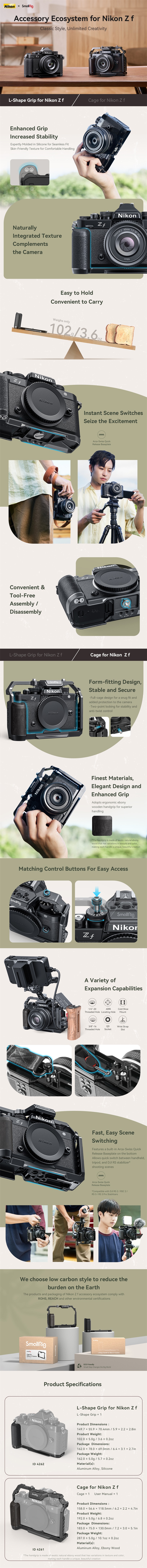 SmallRig Dedicated Handle for Nikon Z f 4262 is designed to improve grip. It matches perfectly with the Nikon Z f, given the same texture and color as the camera. The handle is locked by a 1/4"-20 thumbscrew with a D-ring on the bottom. Its built-in Arca Swiss quick-release plate supports Arca-type tripods; three 1/4"-20 threaded holes in the bottom also support tripods and Manfrotto quick-release plates; and wrist holes can work with Wrist Strap 3848 / 3926. Besides, the bottom plate features an ultra-thin design to realize a net weight of only 102g, making this item more compact and lightweight.