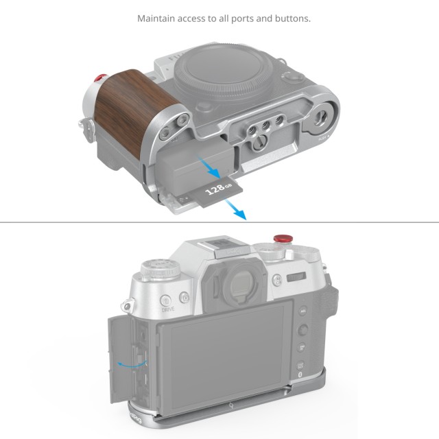 SmallRig L-Shape Mount Plate with Handle for FUJIFILM X-T50 (Silver) 4735B is designed to improve the camera grip. The L-Shape Grip mounts to the camera with a 1/4"-20 screw at the bottom, and the built-in silicone pads prevent scratches. The handgrip is made of natural solid wood, elegant with a rich, natural feel, and designed ergonomically to enhance the grip feeling. The built-in Arca-Swiss quick-release baseplate allows for easy and fast Arca-type tripod assembly and disassembly. Four 1/4"-20 threaded holes at the bottom to attach Manfrotto-type plates and tripods. Strap slot for Wrist Strap (ID: 3848). The built-in flat wrench on the bottom for easy accessory assembly and disassembly. The grip comes with the exclusive hot shoe cover imprinted with the “FUJIFILM” sound wave and the year of foundation as our tribute to FUJIFILM. It also comes with a shutter release button to ensure a soft and comfortable finger touch.