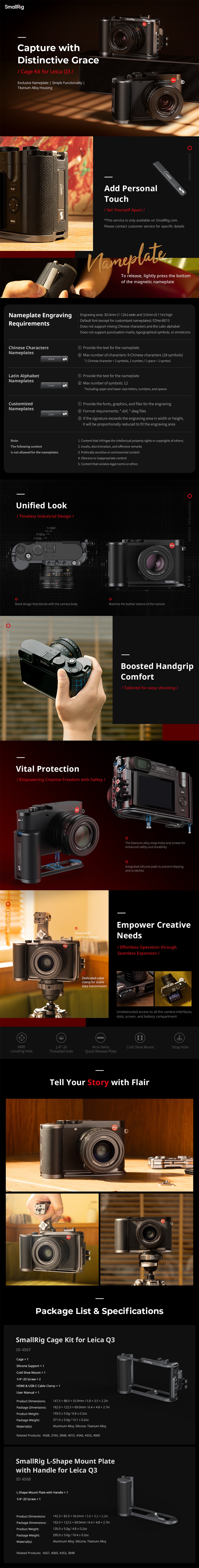 SmallRig L-Shape Mount Plate with Handle for Leica Q3 4568 is designed to improve your camera grip experience. The L-Shape Mount Plate with Handle is securely fastened at the bottom with a 1/4"-20 screw and features multiple built-in silicone pads to prevent scratches on the camera body. It features the same texture and color scheme as the camera body, ensuring a seamless fit while providing a personalized touch with a customized engraved nameplate. Key load-bearing components such as dual-sided strap holes and screws are made of durable titanium alloy.