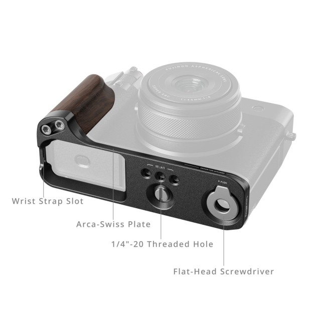 SmallRig L-Shape Mount Plate with Wooden Handle for FUJIFILM GFX100RF (Black) 5266 is expertly designed to enhance both the aesthetics and control of your camera. It attaches securely with a 1/4"-20 screw and features built-in silicone pads to prevent scratches.