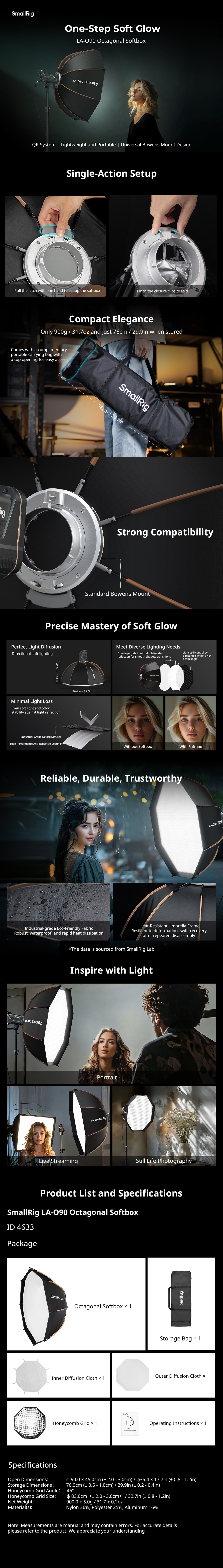 SmallRig LA-O90 Octagonal Softbox 4633 is a versatile 90cm / 39.0in diameter octagonal softbox designed for multi-purpose use. The interface features a universal Bowens mount design, compatible with SmallRig RC 120D / RC 120B / RC 220D / RC 220B / RC 350D / RC 350B / RC 450D / RC 450B as well as other brands using the Bowens mount for point light sources. Utilizing the latest generation quick-release structure, installation and disassembly can be completed with a single click, streamlining the user experience to provide you with the best usability. Comes with a 45° honeycomb grid to effectively control the light spread, suitable for a wider range of scenarios. Utilizing industrial-grade soft light materials and high-reflective coatings, LA-O90 Octagonal Softbox comes standard with two soft light diffusers to achieve the best light effect, catering to a variety of your needs.