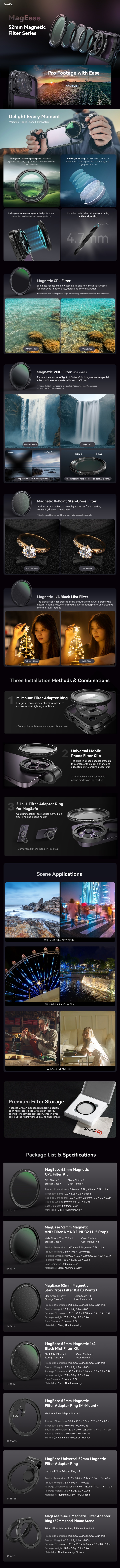 Made of German Schott B270i HD glass, the filter features waterproof, stain-resistant, mildewproof, and scratch-resistant AR coatings, with less color cast, as well as a CNC-machined ultra-thin frame. No vignetting even in shooting using an ultra-wide angle lens. It can be magnetically and securely attached to SmallRig magnetic filter adapter ring.
