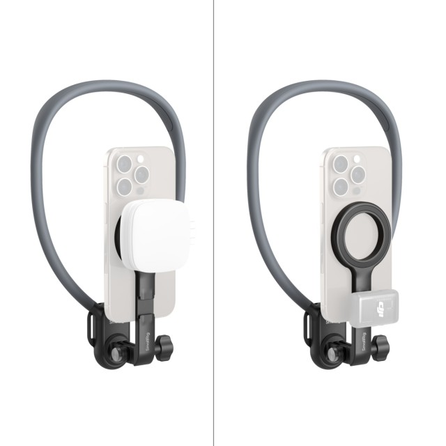 The neck mount features a universal 2-prong mount for action cameras and a magnetic phone mount for instant iPhone attachment. The phone mount is equipped with 17 strong N52 magnets for a secure hold, along with an additional magnetic adapter ring for Android and non-MagSafe devices. When not in use for smartphones, the neck mount can directly accommodate action cameras.