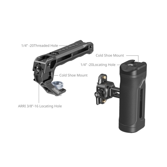 SmallRig mini Side and Top Handle Kit 5949 is designed for comfortable handheld shooting. The kit includes a NATO side handle, an ARRI locating top handle, and a NATO rail, ensuring seamless compatibility with various camera cages. These handles offer versatile expansion options through multiple interfaces, including 1/4"-20 locating holes for attaching accessories like remote controllers (ID 3902) or magic arms (ID 3873), as well as cold shoe mounts for attaching monitor mounts (ID 2905B), microphones (ID 3487), or video lights (ID 3286B).