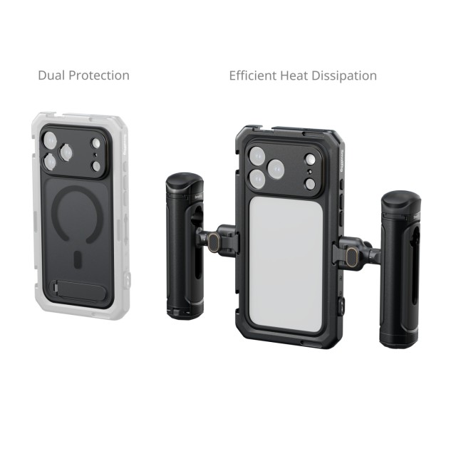 SmallRig Mobile Dual Handheld Kit for iPhone 17 Pro Max 5541 is a professional dual handheld shooting solution designed specifically for iPhone 17 Pro Max, facilitating professional-level video recording, live streaming, and short film production. This comprehensive kit includes a phone case, video cage, rotatable wireless control side handle, rotatable side handle, and TPU soft bumper.