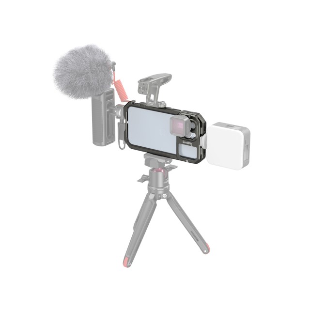 SmallRig Mobile Video Cage 3561 is a multifunctional dedicated cage designed for iPhone 13 Pro Max for professional videography, live streaming, and vlogging. The compact, formfitting cage weighs only 95g and features 1/4"-20 anti-twist threaded holes and cold shoes that support accessories as Side Handle 2772, Tripod BUT2664, Microphone 3452, and LED Light 3286. Its back lens cover is interchangeable and compatible with M-mount or 17mm threaded lenses for better image quality. The hollow design does not block iPhone’s buttons, ports and allows using radar, ultra-wide-angle lenses, and wireless charging. With a quick-lock design, the cage becomes easier to assemble and disassemble, safer, and more stable, it will not pop up due to accidental touch after being locked. Metal-made full cage, alongside built-in shims, protects smartphone and prevents vibration and scratches. The cage enables horizontal and vertical shooting.