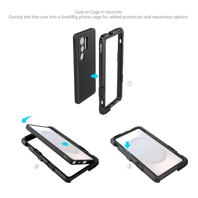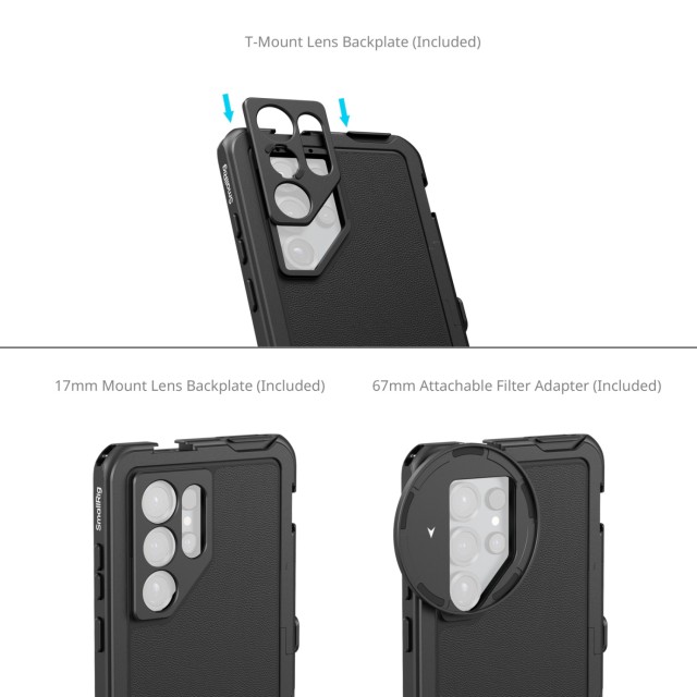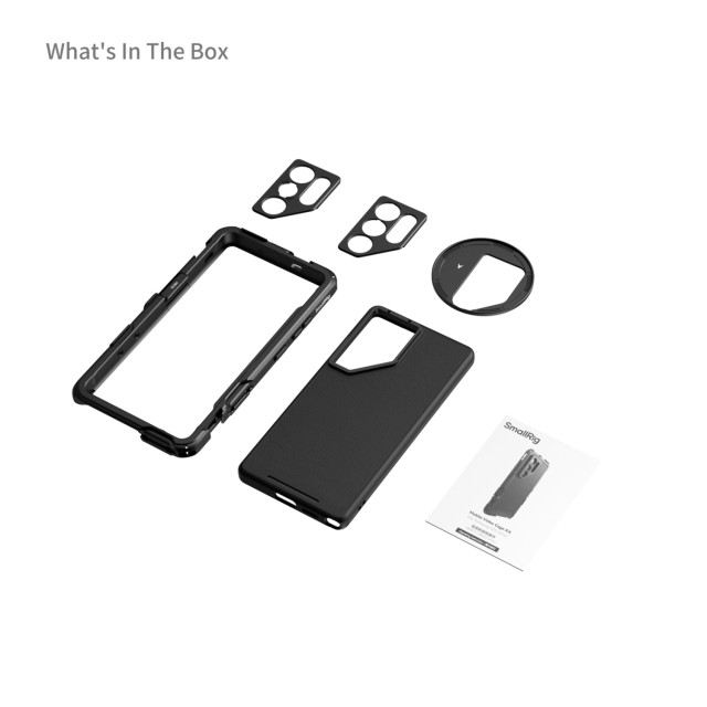 SmallRig Mobile Video Cage Kit for Samsung S25 Ultra 5254 is a versatile solution designed for professional-grade filming, live streaming, and short film production with Samsung S25 Ultra. The kit includes a protective phone case, a video cage, a dedicated T-mount backplate, a 17mm lens backplate, and a magnetic filter backplate. The phone case provides daily protection and can be paired with either the T-mount or 17mm lens backplate for attaching external lenses, or with the magnetic filter backplate for 67mm magnetic filters, ensuring high-quality video production.