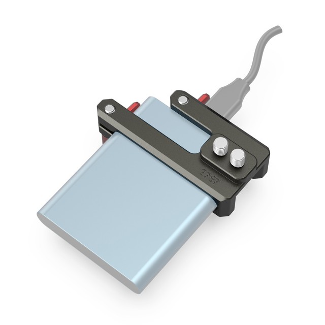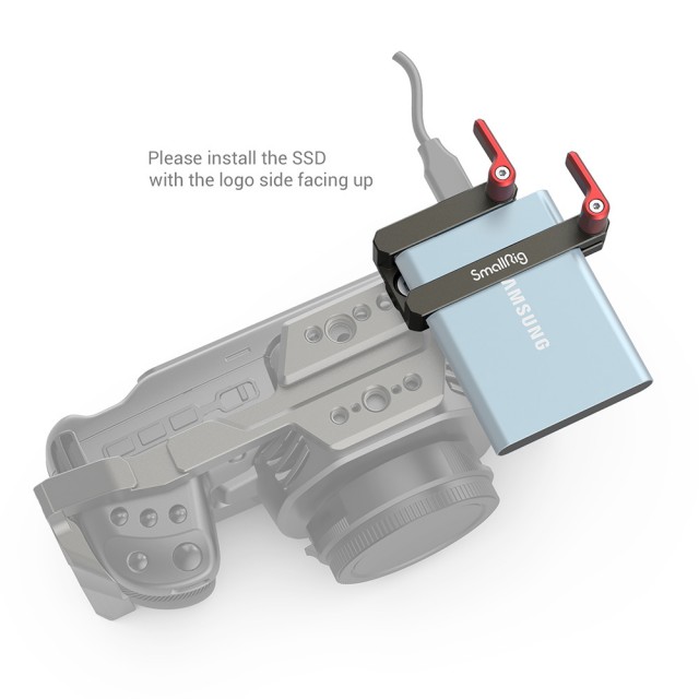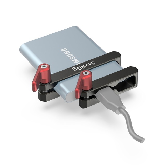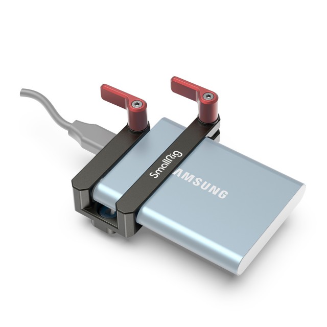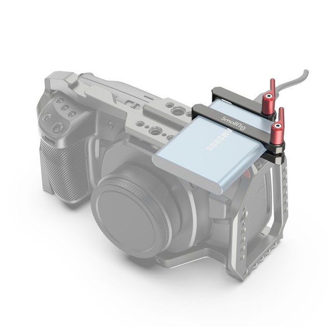 SmallRig Mount for Samsung T5 SSD (Dark Olive) 2767 enables you to attach a Samsung T5 SSD to select SmallRig cages such as BMPCC 4K/6K cage 2766. It attaches to the cage using two included 1/4”-20 screws, securing both the SSD and its connected USB Type-C cable by ratcheting thumbscrew. The mount's offset attachment on the top left corner of the cage helps avoid interference with an attached top handle, side handle, or other accessories.