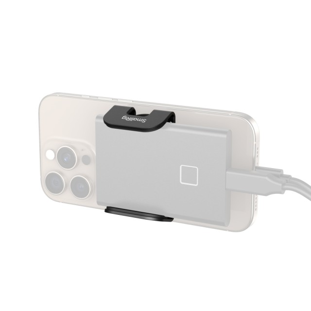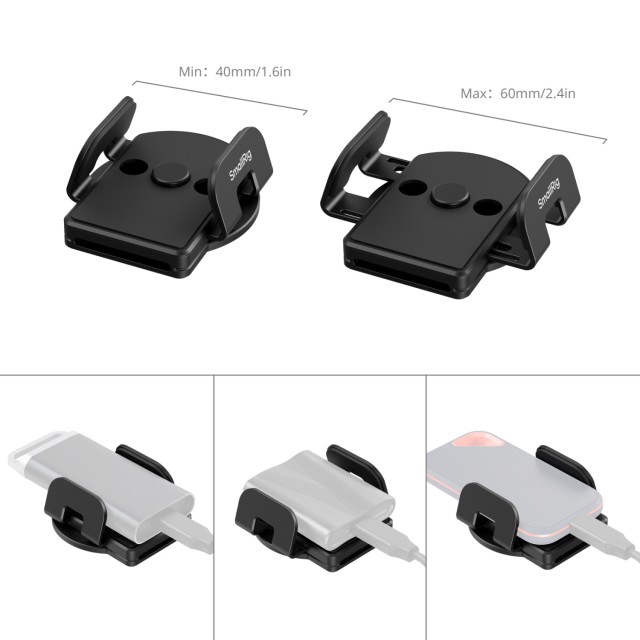 SmallRig Mounting Clamp for External SSD 5397 securely holds portable SSDs (40 -60mm wide x 8 - 17mm thick / 1.6 - 2.4in wide x 0.3-0.7in thick) on camera cages and L-shape mount plates featuring 1/4"-20 threaded holes and MagSafe-compatible iPhones.