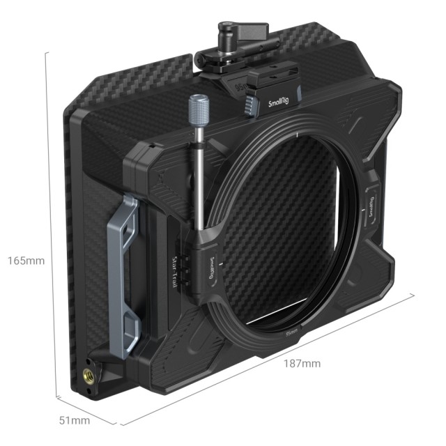 SmallRig Multifunctional Modular Matte Box (Φ95mm) Basic Kit 3556 As one of the Star-Trail series matte boxes, SmallRig Multifunctional Modular Matte Box (Φ95mm) Basic Kit 3556 is designed for mirrorless cameras to prevent sunlight or other light from causing glare and flare and to control images on the screen. It comes standard with four threaded adapter rings (Φ67-95mm / Φ72-95mm / Φ77-95mm / Φ82-95mm) for circular filters like VND, GND, CPL, common DSLR lens and Φ95mm cine lens or you can separately purchase Adapter Rings Kit (Φ52-95mm / Φ55-95mm / Φ58-95mm / Φ62-95mm / Φ86-95mm) 3383 for more compatibilities.