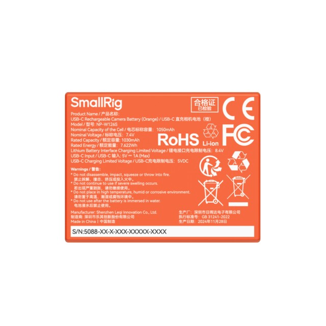 SmallRig NP-W126S USB-C Rechargeable Camera Battery (Orange) 5088 allows being charged via a power bank, power strip, car charger, or other special chargers. With high-current charging (5V 1A) and 1050mAh nominal capacity, you can make the battery full in 2.5 hours and run for a longer time. Fully decoded without pop-ups, this visually distinctive battery features frosted ABS and PC shells, which are fire-resistant and durable. It is exactly the same size as the original camera battery, hence no worries about it getting stuck.
