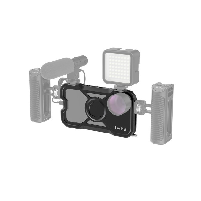 SmallRig Pro Mobile cage for iPhone 11 (Black) CPA2455 is designed to protect your iPhone 11, and provide access to attach other accessories for mobile photo & video shooting, live streaming, interviewing, vlogging, etc. It features a thumb screw on one side to ensure quick mounting and dismounting of the phone. It comes with two cold shoes and multiple 1/4”-20 threaded holes, allowing mount of different accessories like a microphone, LED light, tripod, etc., and supports both horizontal and vertical shooting. It’s compatible with the 17mm thread lens. Those 1/4”-20 thread holes with notches on the top and at the bottom can be used to attach SmallRig Aluminum Side Handle for Smartphone Cage HSS2424 for handheld shooting, or SmallRig Mobile Phone Cable Clamp BSC2390 to secure the cable during shooting. The inbuilt shims help absorb shocks and prevent the phone from scratching. It also comes with a lanyard hole for a wrist strap.