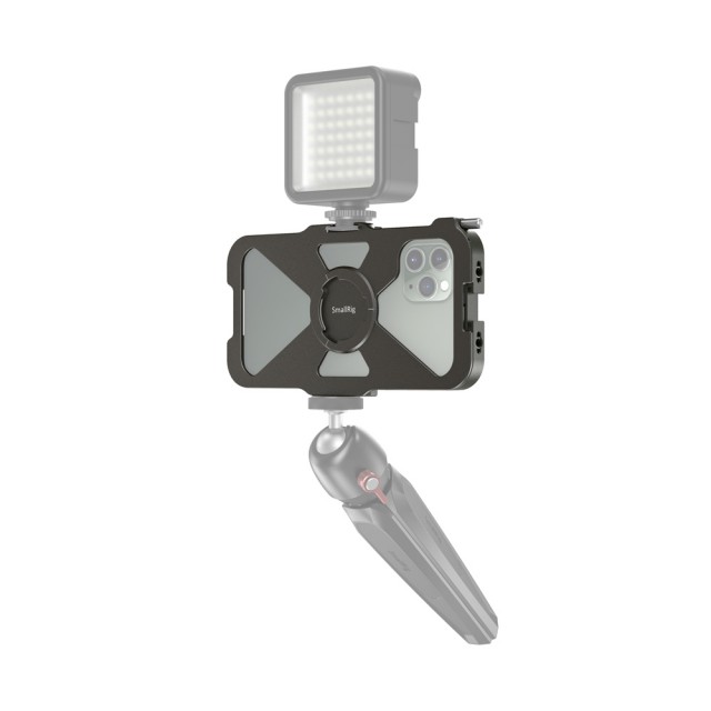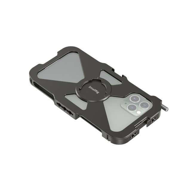 SmallRig Pro Mobile cage for iPhone 11 Pro CPA2471 is designed to protect your iPhone 11 Pro, and provide access to attach other accessories for mobile photo & video shooting, live streaming, interviewing, vlogging, etc. It features a thumb screw on one side to ensure quick mounting and dismounting of the phone. It comes with two cold shoes and multiple 1/4"-20 threaded holes, allowing mount of different accessories like a microphone, LED light, tripod, etc., and supports both horizontal vertical shooting. It's compatible with SmallRig Aluminum Side Handle for Smartphone Cage HSS2424 for handheld shooting, and SmallRig Mobile Phone Cable Clamp BSC2390 to secure the cable during shooting. The inbuilt rubber shims help absorb shocks and prevent the phone from scratching. The hollow-out design for weight loss and mobile phone cooling avoids the side buttons and the interface as well as the antenna area to avert the risk of signal interference. It also comes with a lanyard hole for a wrist strap.
