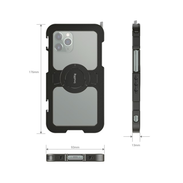 SmallRig Pro Mobile cage for iPhone 11 Pro Max CPA2512 is designed to protect your iPhone 11 Pro Max, and provide access to attach other accessories for mobile photo & video shooting, live streaming, interviewing, vlogging, etc. It features a thumb screw on one side to ensure quick mounting and dismounting of the phone. It comes with two cold shoes and multiple 1/4"-20 threaded holes, allowing mount of different accessories like a microphone, LED light, tripod, etc., and supports both horizontal vertical shooting. It's compatible with SmallRig Aluminum Side Handle for Smartphone Cage HSS2424 for handheld shooting, and SmallRig Mobile Phone Cable Clamp BSC2390 to secure the cable during shooting. The inbuilt rubber shims help absorb shocks and prevent the phone from scratching. The hollow-out design for weight loss and mobile phone cooling avoids the side buttons and the interface as well as the antenna area to avert the risk of signal interference. It also comes with a lanyard hole for a wrist strap.
