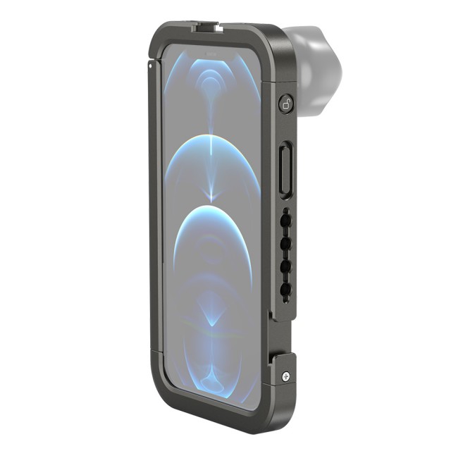 SmallRig Pro Mobile Cage for iPhone 12 Pro 3075 is a multi-function mobile phone cage specially designed for your iPhone 12 Pro to help achieve a higher level of mobile phone photography, videography, vlogging, live streaming, interviewing, and filmmaking. The cage comes with two cold shoe mounts to support a microphone and a LED light. It also features multiple 1/4 threaded holes in the top, bottom, left, and right sides to attach different accessories on your needs, like a tripod, a side handle, etc. It supports both horizontal shooting and vertical shooting. Inbuilt shims help absorb shocks and prevent your phone from scratching. The Lens Mount on the back enables you to attach an external lens to your phone easily. The Quick-Lock design ensures a tighter fit and quicker way to mount/dismount your phone and will be safer and more stable. Your phone will not pop out due to an accidental touch after being locked.