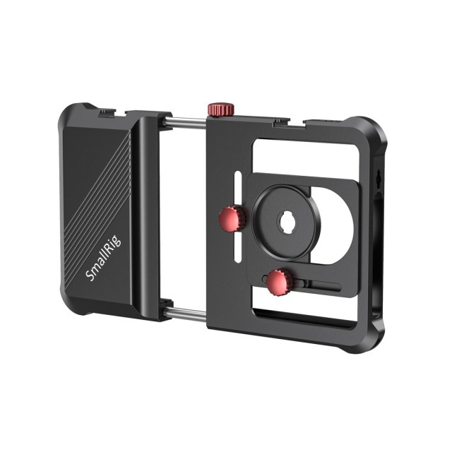 SmallRig Professional Universal Mobile Phone Cage CPU2494 is designed to fit most smartphones in the market. It’s compatible with smartphone width from 63.5mm to 87.5mm. It features a spring-loaded clamp for quick attach/detach of the phone with a greater locking force. The cage comes with multiple 1/4”-20 threaded holes and two cold shoes for attaching an LED light, microphone, tripod, etc. Those 1/4”-20 thread holes with notches could be used to mount a SmallRig Mini Safety NATO Rail for Mobile Phone Cage BUN2395 and the side 1/4”-20 thread holes can be used to attach the SmallRig Mobile Phone Cable Clamp BSC2390 to ensure a tight joint of the cable like a Lightning cable, USB-C cable or an adapter, or attach a SmallRig Aluminum Side Handle for Smartphone Cage HSS2424 for handheld shooting. It comes with a 37mm lens thread mount for attaching 37mm thread lenses. The cage features two holes on the bottom for lanyard attachment. The built-in rubber pads could protect possible scratches to the phone.