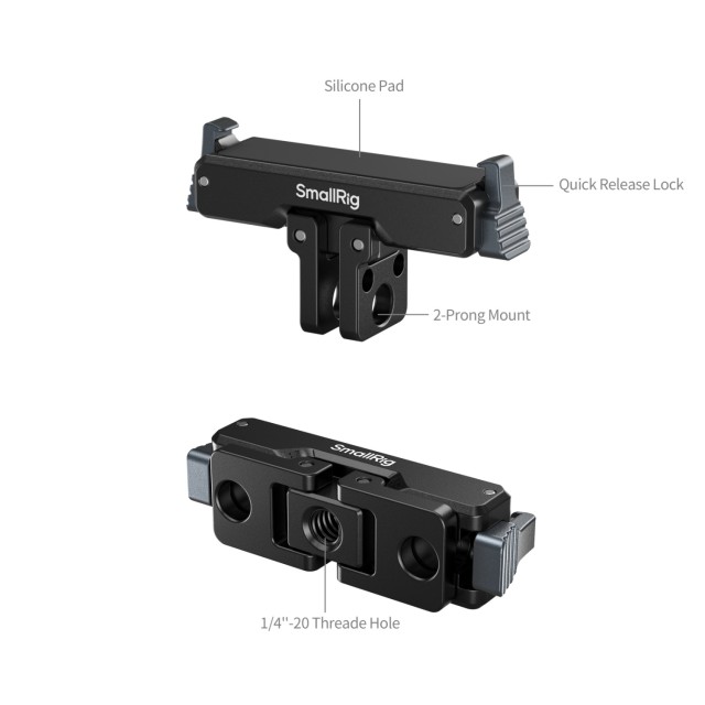 The base is equipped with a folding 2-point mount and a 1/4"-20 thread, ensuring wide compatibility with SmallRig accessories such as suction cup mounts (ID 4235), crab claws (ID 4102B), selfie sticks (ID 5403), and neck mounts (ID 5126).