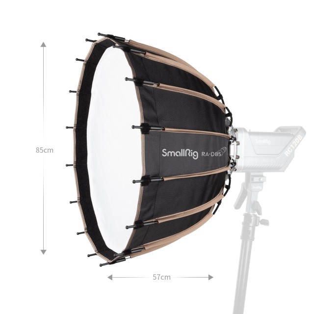 SmallRig RA-D85 Parabolic Softbox 3586 is a versatile soft light accessory with an 85 cm diameter. Its universal Bowens mount design makes it compatible with SmallRig RC 120D/RC 120B/RC 220D/RC220B and other Bowens mount lights. Thanks to a new quick-release design, you can easily install and disassemble the dome in 15 seconds. The RA-D85 also includes a high-quality fabric honeycomb filter, two diffusion filters (internal + external), and a carrying bag.