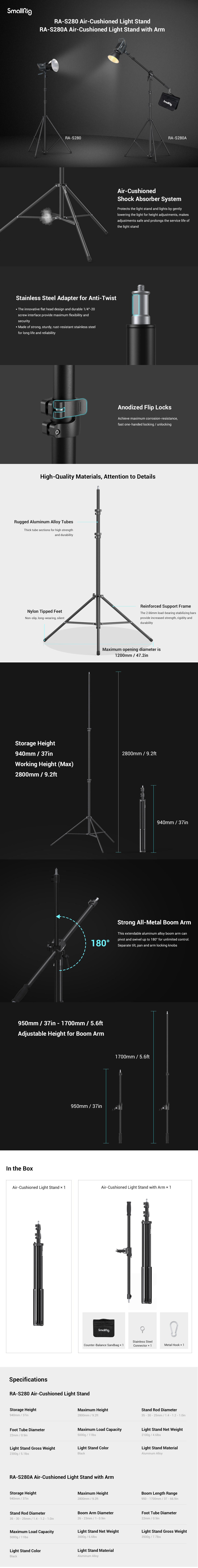 Air-cushioned design to protect lights and fingers from accidental descent. Freely adjustable height from 94cm to 280cm, suitable for different scenarios; folded length of 94cm, easy to be carried with. Mainly made of aluminum alloy and iron; the iron support bar is 2.66mm thick and 15mm wide and the aluminum alloy knob is strong and durable; comes with a high load-bearing capacity as well as a quick and efficient flip lock.