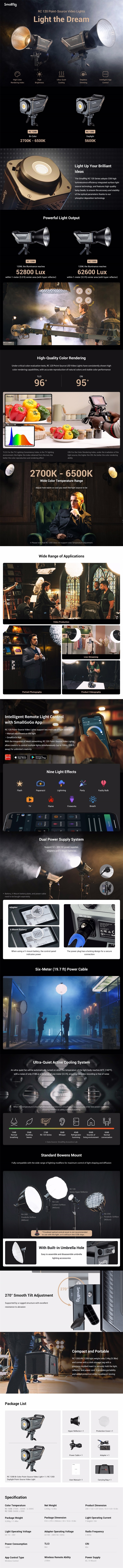 SmallRig RC120D (3612) is the first generation point-source LED light from SmallRig. With the latest COB technology and SmallRig's industrial design excellence, the RC120D is unique: it offers a high-reflectance hyper reflector, at a distance of 1 meter, the center illuminance reaches 62,600 lux, far beyond the same level of products on the market. The reflector also offers high color fidelity (CRI 95+, TLCI 96+), standard Bowens mount, 9 built-in light effects (Paparazzi, Firework, Lightning, Fault Bulb, TV, Breath, Flash, Party, Flame), remotely controlled brightness using SmallGoGo app. RC120D has a fixed color temperature of 5600K (+/- 200K) and 62,600 lux illumination (with reflector).