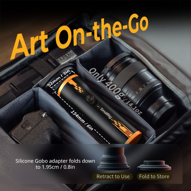 SmallRig RF 10C Portable Focusable LED Video Light "BumbleBee Edition" 5512 is an integral component of SmallRig's portable lighting ecosystem. Crafted from aluminum alloy in a sleek dark color scheme, this compact and lightweight video light is both stylish and practical, fitting easily into any photography backpack. Featuring four-color LED lamp beads (sunset orange, blue, white, and red), with a maximum power of 10W and a CRI Ra≥96, TLCI≥98, illuminance reaches 1,570lux@0.5m / 5600K, this high-quality light source ensures professional color rendering and brightness adjustment to meet various shooting requirements. Equipped with 20+ light filters, it supports a variety of atmospheric projection effects, enhancing your lighting setup for more creative possibilities. The convex mirror's front push-pull design facilitates beam size adjustment, providing the capability for precise focusing in a smaller range (adjustable focus angle of approximately 10°-60°). The zoom adjustment offers smooth control and excellent damping for seamless aperture range adjustments. With a new anti-misoperation feature, the light requires button rotation to power on, effectively averting inadvertent activation that could result in unnecessary power consumption. With a mere 4.3cm (1.7in) diameter, the handle offers a comfortable and ergonomic grip. Featuring three 1/4"-20 threaded holes on the side and rear, this light enables versatile lighting configurations, catering to various shooting scenarios. Equipped with a built-in 27.75Wh lithium battery that supports USB-C charging, this light provides approximately 3 hours of continuous full-power lighting, ensuring uninterrupted support for your shooting needs.