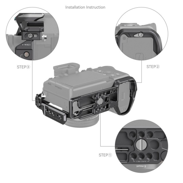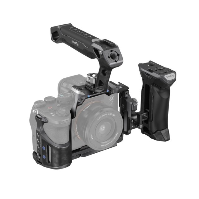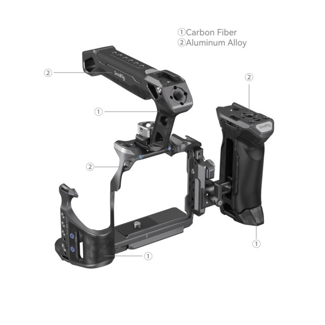 SmallRig "Rhinoceros" Advanced Cage Kit for Sony Alpha 7R V / Alpha 7 IV / Alpha 7S III 3710 is designed to reduce burdens on arms, increase stability, and provide accessory mounting points. The kit includes a cage, a top handle, a side handle, and an HDMI cable clamp. The cage and the two handles are portable for being made of lighter carbon fiber, hence longer handheld shooting. For the cage, a locating pin, a 1/4"-20 screw, and an M2.5 screw together lock the camera firmly. It features a clean streamlined design that gives full access to the top buttons. The top handle feels comfortable to carry and take a low-angle shot; the side handle, made of light carbon fiber and PU leather, makes for a pleasant and firm grip. and the HDMI cable clamp, tightened via a flat-head screw, protects the interfaces to ensure stable signal transmission. Also, the kit comes with 1/4"-20 threaded holes for Magic Arm 3873, cold shoe mounts for the microphone, LED video light, and ARRI 3/8"-16 locating holes for Side Handle 2914. A NATO rail and an Arca-Swiss quick-release plate add versatility to the cage. Particularly, the Arca-Swiss plate enables a quick switch between handheld, tripod, and gimbal (DJI RS 2 / RSC 2 / RS 3 / RS 3 Pro) modes.