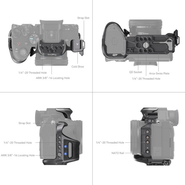 4. Multiple accessory mounting points: 1/4"-20 threaded hole, ARRI 3/8"-16 locating hole, cold shoe mount, NATO rail, QD socket for attaching the handle, microphone, LED video light, monitor, etc.