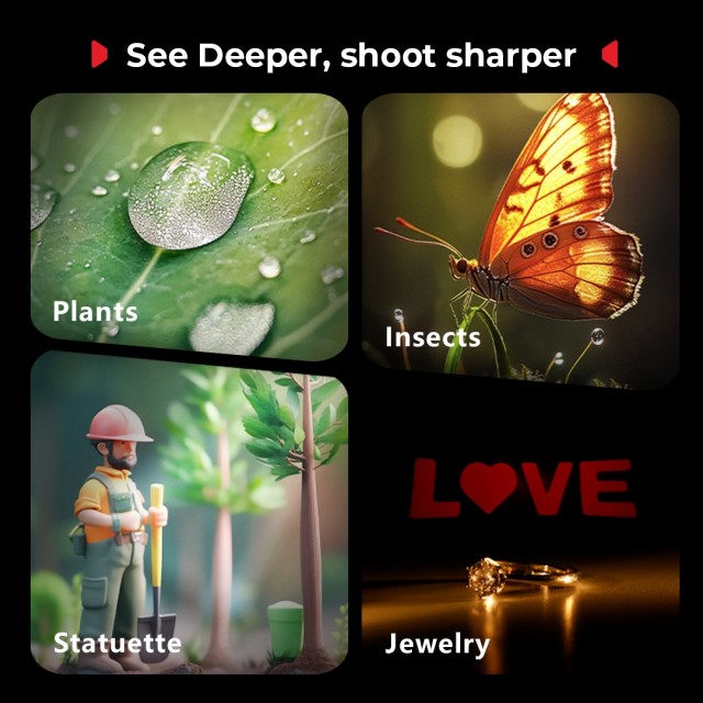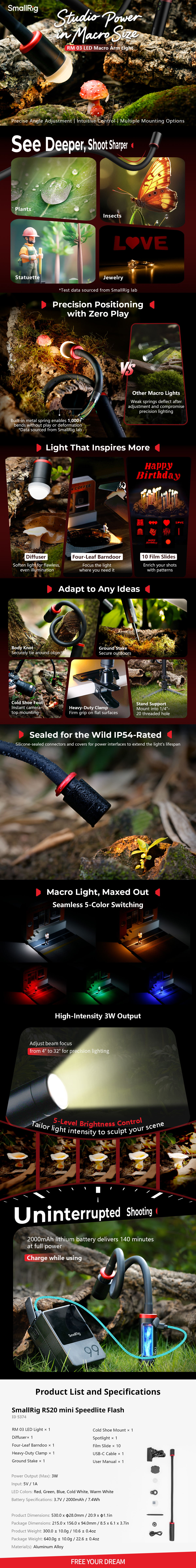 The RM 03 is a specialized LED light designed for macro photography. Its sturdy built-in metal spring allows for effortless adjustment of lighting angles. It comes with light control accessories, including a diffuser and a four-leaf barndoor, along with versatile mounting options such as a heavy-duty clamp and a ground stake, providing unmatched flexibility. With an IP54 rating for weather resistance and five powerful 3W LED lamp beads that support multi-color output, the RM 03 inspires limitless, long-lasting (up to 140 minutes of runtime) creativity in macro photography.