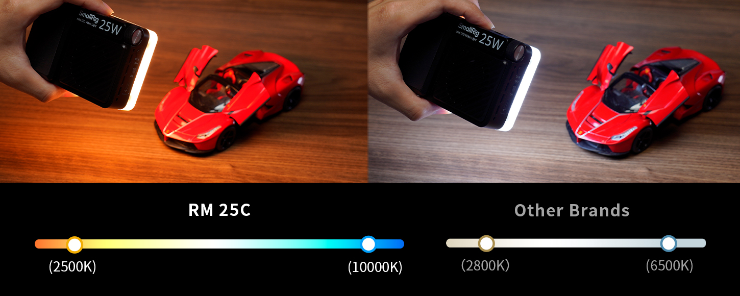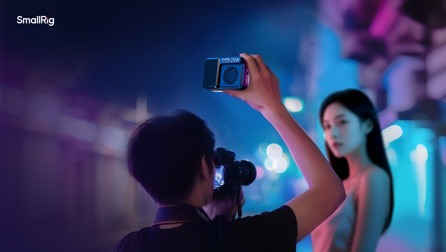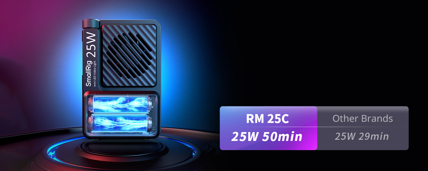 SmallRig RM 25C mini LED Video Light with integrated battery. Versatile RGB+CCT lighting: Features CRI 96, TLCI 99, adjustable bi-color temperatures from 2500K to 10000K, 36000+ colors, and 14 built-in lighting effects. Ideal for still life, food photography, and creative portrait lighting.