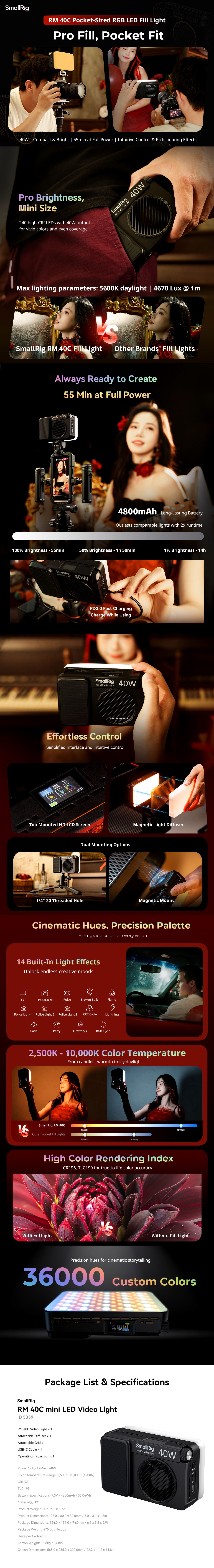 The SmallRig RM 40C is a 40W high-power RGBWW mini LED light. Compact yet powerful, it features an extended 55-minute runtime and full-color RGB lighting for wider color temperature and gamut control. With user-friendly operation, magnetic mounting, and PD fast charging, it’s perfect for on-the-go creators.