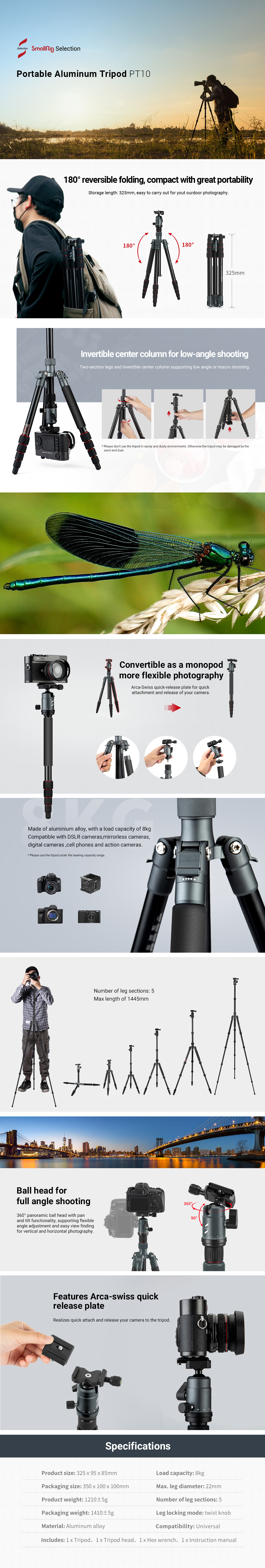 SmallRig Selection Portable aluminum camera tripod PT10 3257 is made of aluminum alloy, with a safety payload of 8kg. The tripod supports DSLRs, mirrorless cameras, etc. Its five-section legs secured by twist locks enable a maximum working height of 1445mm and excellent stability. It features reverse folding to realize a folded length of only 325mm, making it easy to carry around. Its two-section invertible center column enables you to make low-angle and macro shots. A detachable monopod brings great flexibility. The tripod comes with a ball head that supports panoramic shooting and an Arca-Swiss-type quick release plate for a quick switch between handheld and tripod shots.