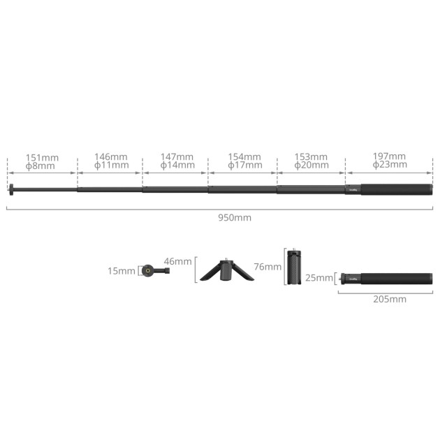 SmallRig Selfie Stick for Action Cameras 5403 includes a selfie stick, a smartphone clamp, an action camera mount, a tripod, and a wrist strap. Made of aircraft-grade aluminum alloy for increased sturdiness and durability, this item features hexagonal extendable sections so that action camera does not twist, hence more stability. Extending up to 95cm and folding down to only 20cm, the pocket-sized stick also comes with multiple accessories to support smartphone and action camera, such as GoPro HERO13 Black, insta360 X5, DJI Action 5 Pro, AKASO. Particularly, when using insta360 X4, you can remove the stick from your photos and videos. Among the accessories, the wrist strap helps keep this stick and camera secure to your wrist to ensure safety; the tripod, which has one 1/4"-20 screw on the top, attaches this stick via its bottom 1/4"-20 threaded hole to take group photo, fixed shot, etc.