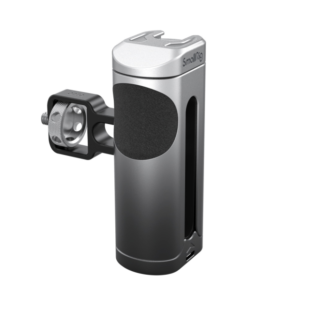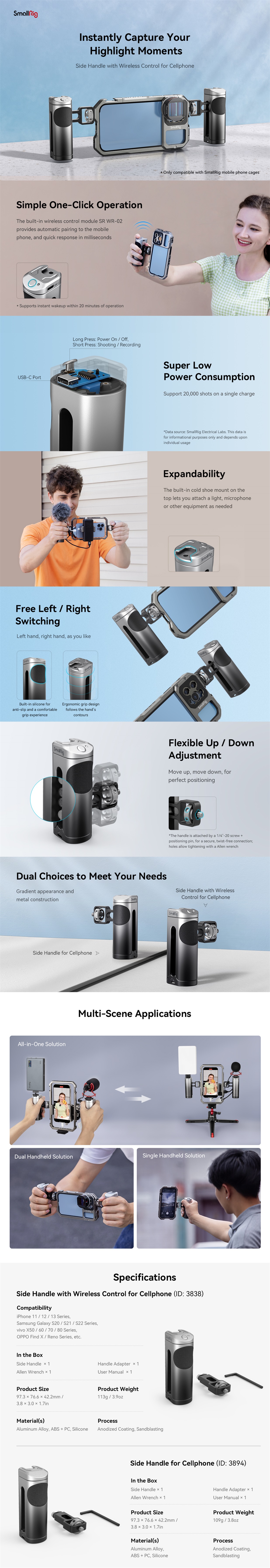 SmallRig Side Handle for Cellphone 3894, features a cold shoe mount on the top of the handle for attaching microphone or LED light for more professional shooting. The handle can be used on the left or right hand by adjusting the handle connector also can be moved up and down according to the center of gravity and position of accessories for a better grip experience. The surface of the handle is made of aluminum alloy with gradient anodizing, which makes it durable and visually impressive. Also, it comes with hole at the bottom for attaching hand strap to prevent accidental falling during shooting.