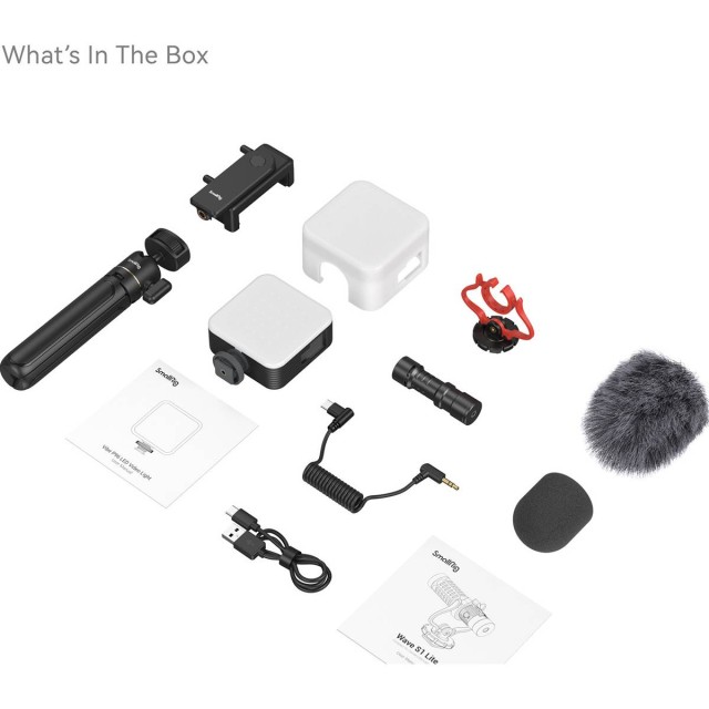 SmallRig Smartphone Vlog Tripod Kit VK-50 Advanced Version 4369 is composed of a tabletop telescoping tripod, Easy Loading smartphone holder, Wave S1 Lite On-Camera Microphone, Vibe P96 LED Video Light, and a softbox. This compact and portable kit has an impressive load-bearing capacity of 1.5kg / 3.3lb. One 1/4"-20 screw attaches the tripod to the smartphone holder, which features a unique easy-to-retract design for swift smartphone attachment and removal. The 360-degree grip rotation allows a secure and quick switch between portrait and landscape orientations, while a pair of cold shoe mounts allow for the attachment of compatible accessories. Besides, the LED video light comes with three cold shoe mounts that allow for the attachment of more accessories. It has a 2700-6500K CT and a battery life of up to 13.5 hours. The tripod can be folded down to only 16cm / 6.3in. Shotgun microphone with 3.5mm (0.13in) to Type-C Cable (also comes with Type-C to Lightning Adapter) for an unstoppable experience.