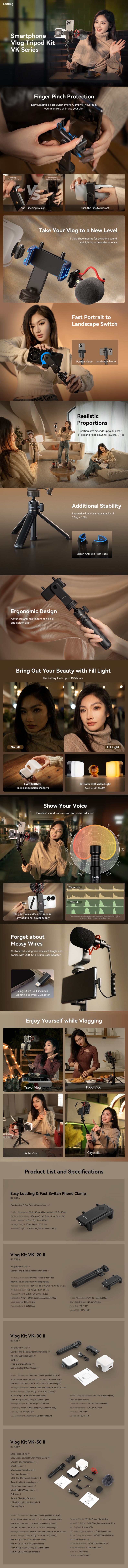 SmallRig Smartphone Vlog Tripod Kit VK-50 Advanced Version 4369 is composed of a tabletop telescoping tripod, Easy Loading smartphone holder, Wave S1 Lite On-Camera Microphone, Vibe P96 LED Video Light, and a softbox. This compact and portable kit has an impressive load-bearing capacity of 1.5kg / 3.3lb. One 1/4"-20 screw attaches the tripod to the smartphone…