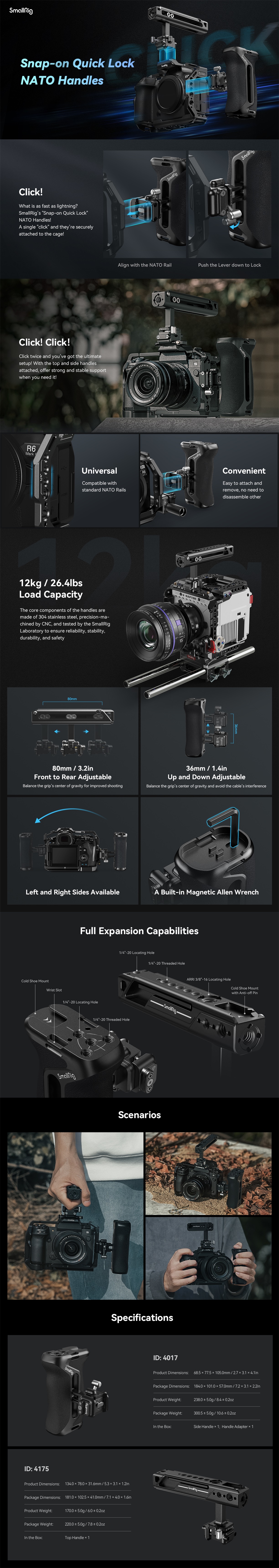 SmallRig Snap-on Quick Lock NATO Side Handle 4017 is designed to help camera movement, and stabilize left- and right-handed shots, while providing basic accessory mounts. Compatible with standard NATO rail, the handle snaps on or releases a NATO rail within one second without first removing other accessories, saving shooting time. It can be further tightened by a wrench. Non-slip silicone feels comfortable and the ergonomic design makes it fit both left and right hands.