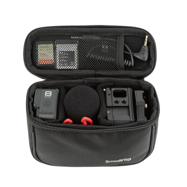 SmallRig Storage Bag 3704 is designed for quick and easy storage of camera accessories, providing a solution to the problem of small accessories being easily lost and inconvenient to carry. The bag allows storing follow focus 3010, action cameras, compact cameras such as DJI Insta360 GoPro, as well as microphones, LED lights and small V-port batteries. It features inner compartments for power and communication cables and memory cards, and a carry handle on the top and side slots for quick and easy storage and a neat and tidy experience.