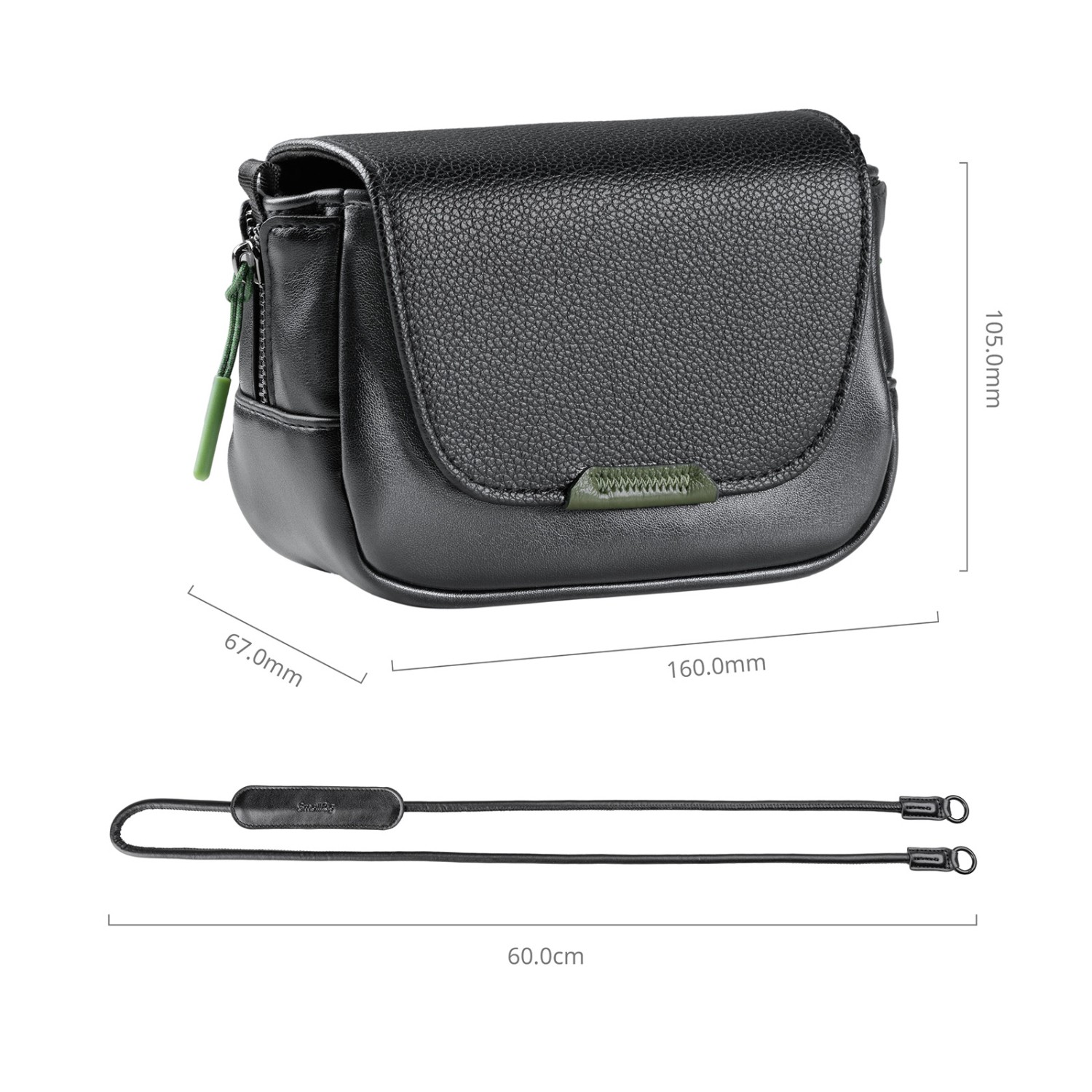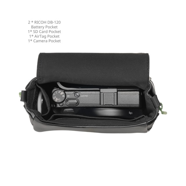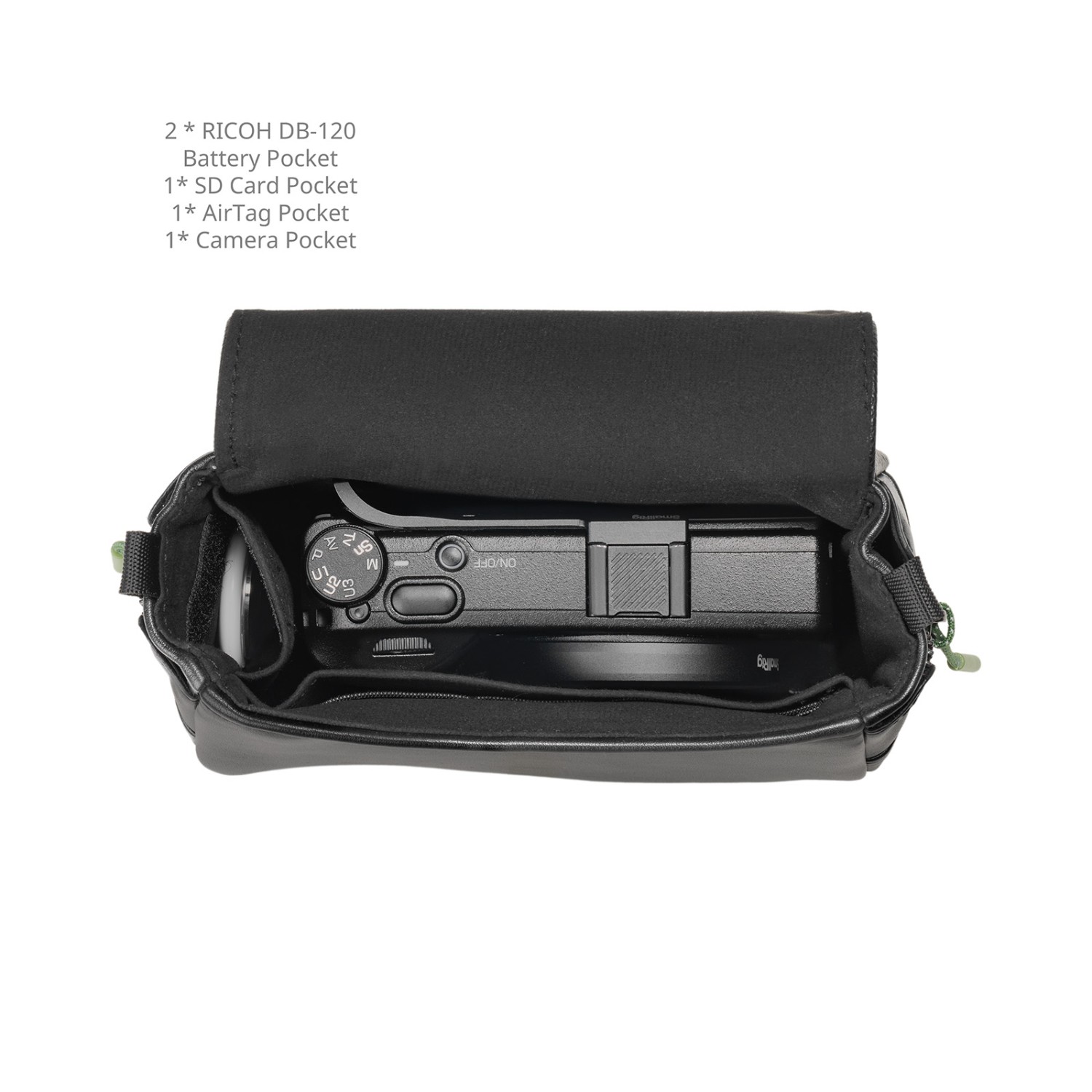 Constructed from premium eco-leather with a microfiber lining, this lightweight bag (136g / 4.8oz) delivers exceptional protection without bulk. The interior is intelligently organized, featuring a main compartment for your camera and compatible accessories (such as Lens Cap: ID 5680; Leather Cases: ID 5676, 5677, 5678; and mini flash), along with dedicated spaces for spare batteries, memory cards, and small items. Additionally, a discreet card slot is integrated into the back panel.