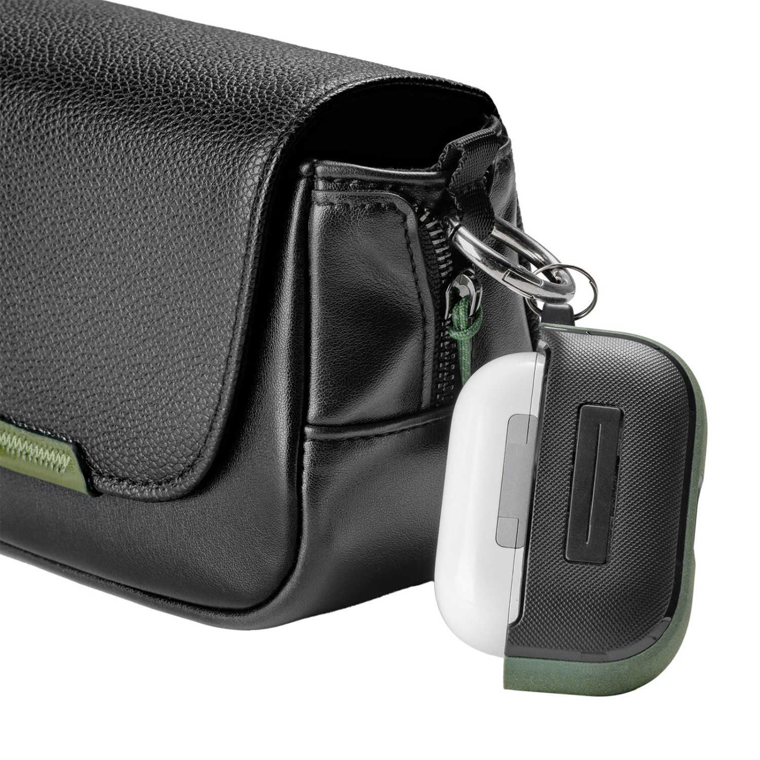 The bag can be used as a standalone crossbody bag or as a backpack insert, facilitated by an included quick release shoulder strap for flexible use. A concealed AirTag compartment allows for secure device tracking. This versatile bag meets the demands of urban photography with style and functionality.