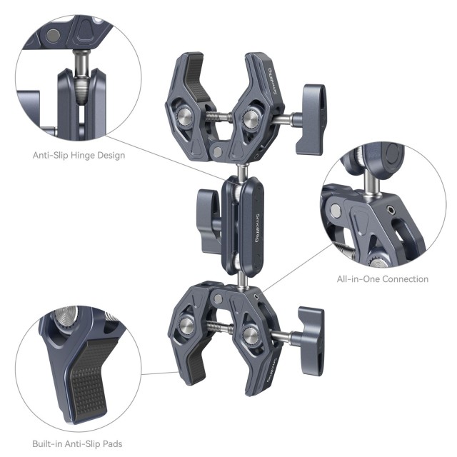 SmallRig Super Clamp with Double Crab-Shaped Clamps 4103B is made of aircraft-grade aluminum alloy and stainless steel, CNC process anodized and carved to increase sturdiness and durability. It features a skeletal design and shark clamp with stronger clamping force as well as widely compatible 3/8"-16 threaded holes. The clamp, which supports a rod of a minimum diameter of 14mm and a surface with a maximum thickness of 65mm, can quickly attach umbrellas, selfie sticks, microphones, etc. to round pipes, tables, handlebars, tripod rods, and handrails.