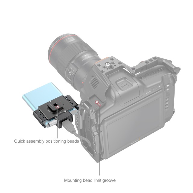 SmallRig T5/T7 SSD Mount for BMPCC 6K PRO 3272 is Samsung T5/T7 SSD compatible and works with the BMPCC 6K PRO cage 3270. It secures to the cold shoe on the top left of the cage and fixes the SSD via extendable spring-loaded clamps on both sides. It comes with a locating bead structure and a built-in 1/4"-20 threaded hole so that you can either attach it to a cold shoe or use a spare screw for mounting. Its internal all-round rubber pads can securely hold the SSD and prevent scratching. It also provides a USB-C cable clamp fixable with a thumb screw. The mount serves as a sound solution for a BMPCC 6K PRO camera using SSD.