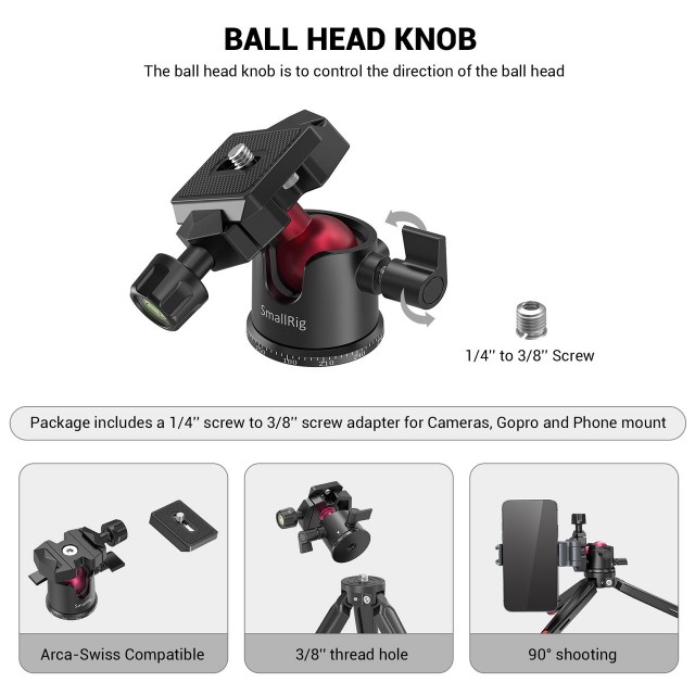 SmallRig Tabletop Mini Tripod with Panoramic Ball Head BUT2664 is the perfect mini tripod for compact DSLRs, mirrorless cameras, smartphones, action cameras, and other devices, and can also act as a grip for handheld shooting. The tripod without ball head holds up to 20kg while the ball head itself holds up to 2kg. It’s solid and secure, and the rubber feet guarantee a stable and slip-free foundation on any surface. The ball head with accurate calibration support 360° panoramic rotation for panoramic shooting, -90°/+45° front tilt and -50°/+50° lateral tilt for multi-angle adjustment including horizontal shooting and vertical shooting. It comes with a standard Arca-Swiss plate, which is compatible with other Arca-Swiss clamps to ensure a quick mount/dismount of your device.