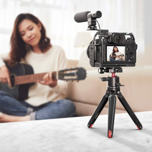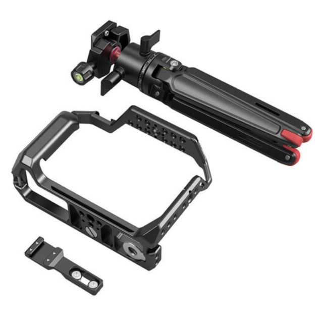 The lightweight aluminum camera cage maintains access to all ports and controls, and it features multiple 1/4"-20 and 3/8"-16 threads, an integrated right-side handgrip, a shoe mount, and an Arca-style base for mounting. The mini tripod is also made from durable aluminum and features a ball head with 360° rotation, -90 to 45° front tilt, and -50 to 50° lateral tilt. The tripod legs are collapsible for handheld use or storage, and they support a load weighing up to 4.4 lb. The shoe extension mounts onto the cage using two 1/4"-20 screws and allows you to add a shoe accessory offset from the cage.
