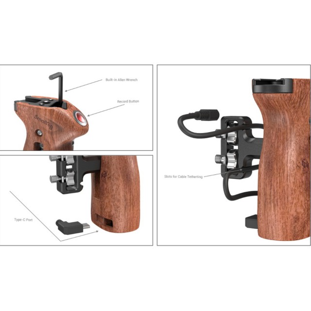SmallRig Threaded Side Handle with Record Start/Stop Remote Trigger 3323 is designed to provide convenient record start/stop control for a stable and comfortable shooting experience. Ergonomically-designed, all-in-one wood handle improves grip experience. It firmly secures to a cage with two 1/4"-20 threads and adjustable height. Its top features 1/4"-20, 3/8"-16 threaded holes and a cold shoe for Monitor Mount 2904 and 2905; its built-in spanner allows for easy disassembly and assembly of accessories. It is equipped with three control cables, supporting Sony A7II/A7III/A7 IV/A6000/A6500, FUJIFILM X-T3/X-T4/X-T20/X-T30, Panasonic GH5/5S/GH6/G9/G95/S5/S1/S1R/S1/BGH1/BS1H and Z CAM E2/M4/S6. Add a longer Control Cable ID:3407 which is sold separately to your shoulder kit for Sony cameras. The handle is compatible with the following cameras: