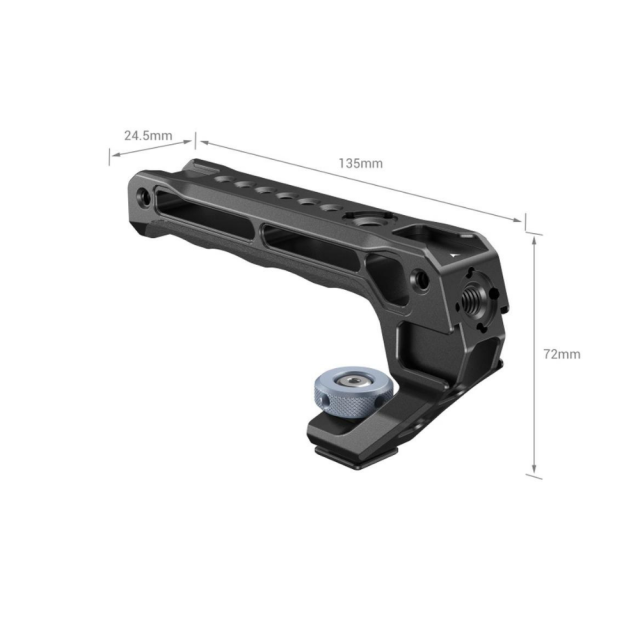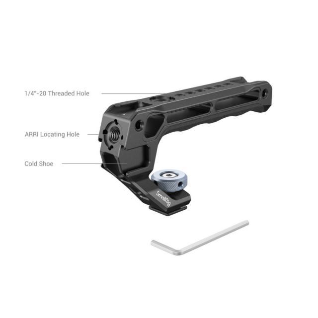SmallRig Top Handle with Cold Shoe 3764 is designed to facilitate low-angle shot and reduce burdens on arms. The ergonomic handle, featuring anti-slip and anti-freeze silicone, feels comfortable and weighs only 129g because of a hollowed-out structure. It has 3 front cold shoes and 2 rear cold shoes that allow simultaneously mounting microphone, LED light, monitor, and other accessories. ARRI 3/8" -16 locating holes support Monitor Mount 2903, 2348 to attach monitors; 1/4 "-20 threaded holes support Magic Arm 2070 for monitors and Remote Control 2924 for recording. An Allen Wrench helps tighten the locking screw, making it easy to assemble and disassemble.