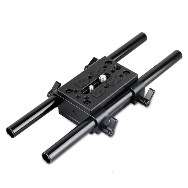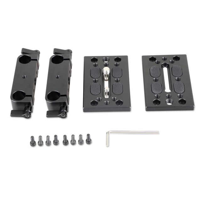 SmallRig Tripod Mounting Kit W/15mm Rail Block 1798 is combined by two SmallRig Tripod mounting plate w/15mm rail block. Used for long length, front heavy, camera packages. Attach it to the tripod plate with a 3/8''-16 screw and 1/4''-20 screw, then you can mount your dovetail base plate on it. It clamps onto 15mm rails for accessories attachment, such as follow focus, matte box, etc. The 40mm groove makes it possible to balance a front heavy camera on your tripod properly.