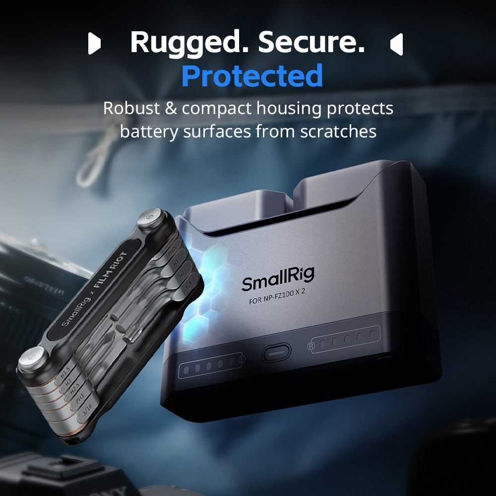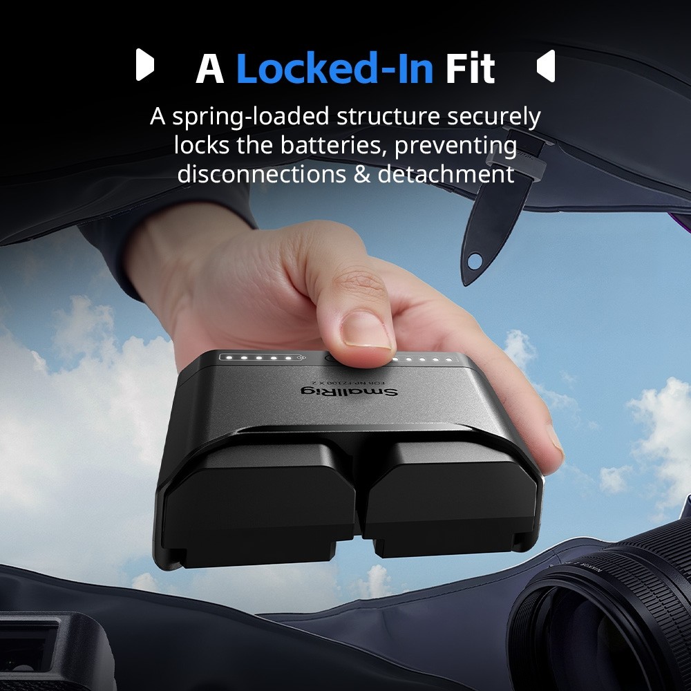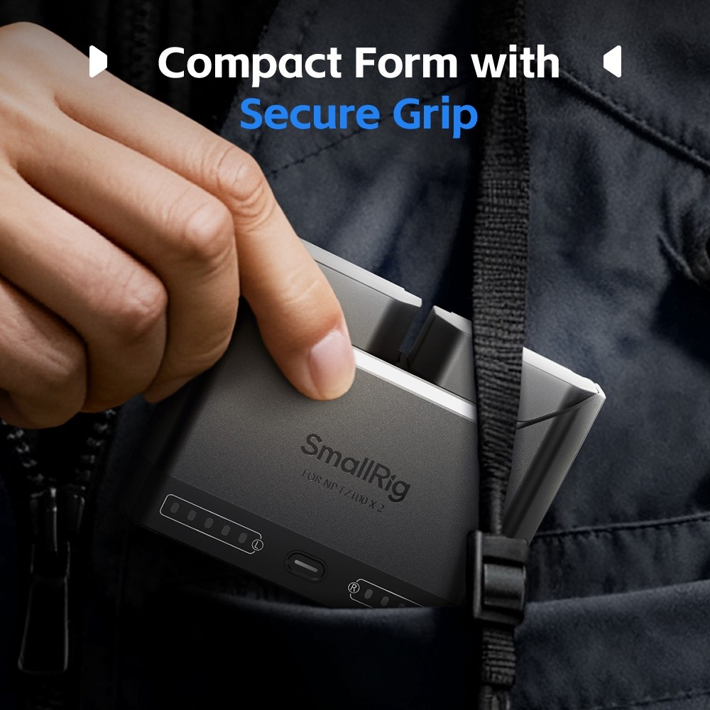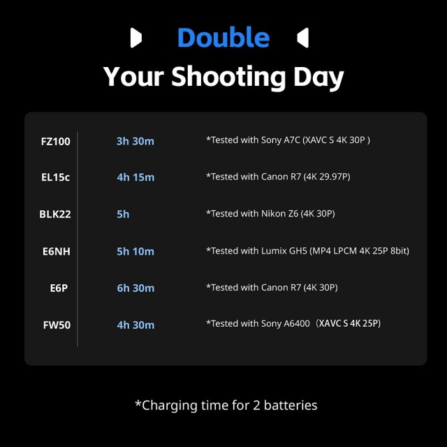 Each battery delivers a true-rated output of 1030mAh, providing extended shooting time for demanding workflows. The charger’s dual-slot design allows for simultaneous charging of two batteries or single-battery charging, fully charging two batteries in approximately 1.5 hours for optimal efficiency.